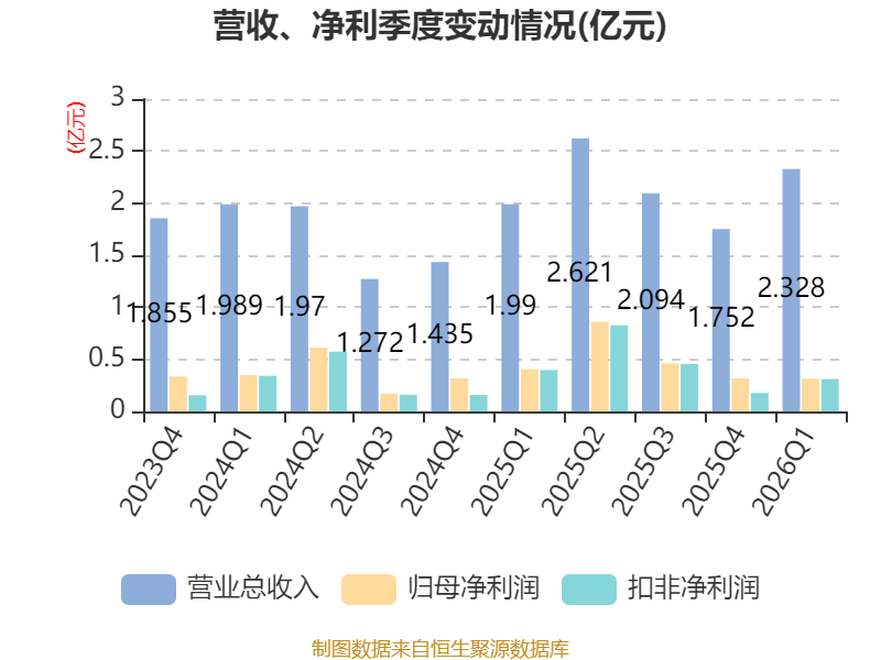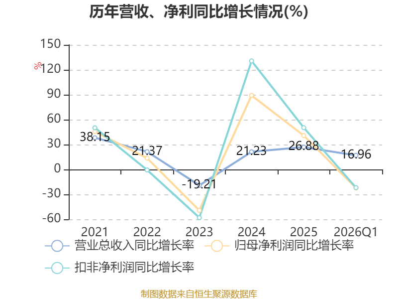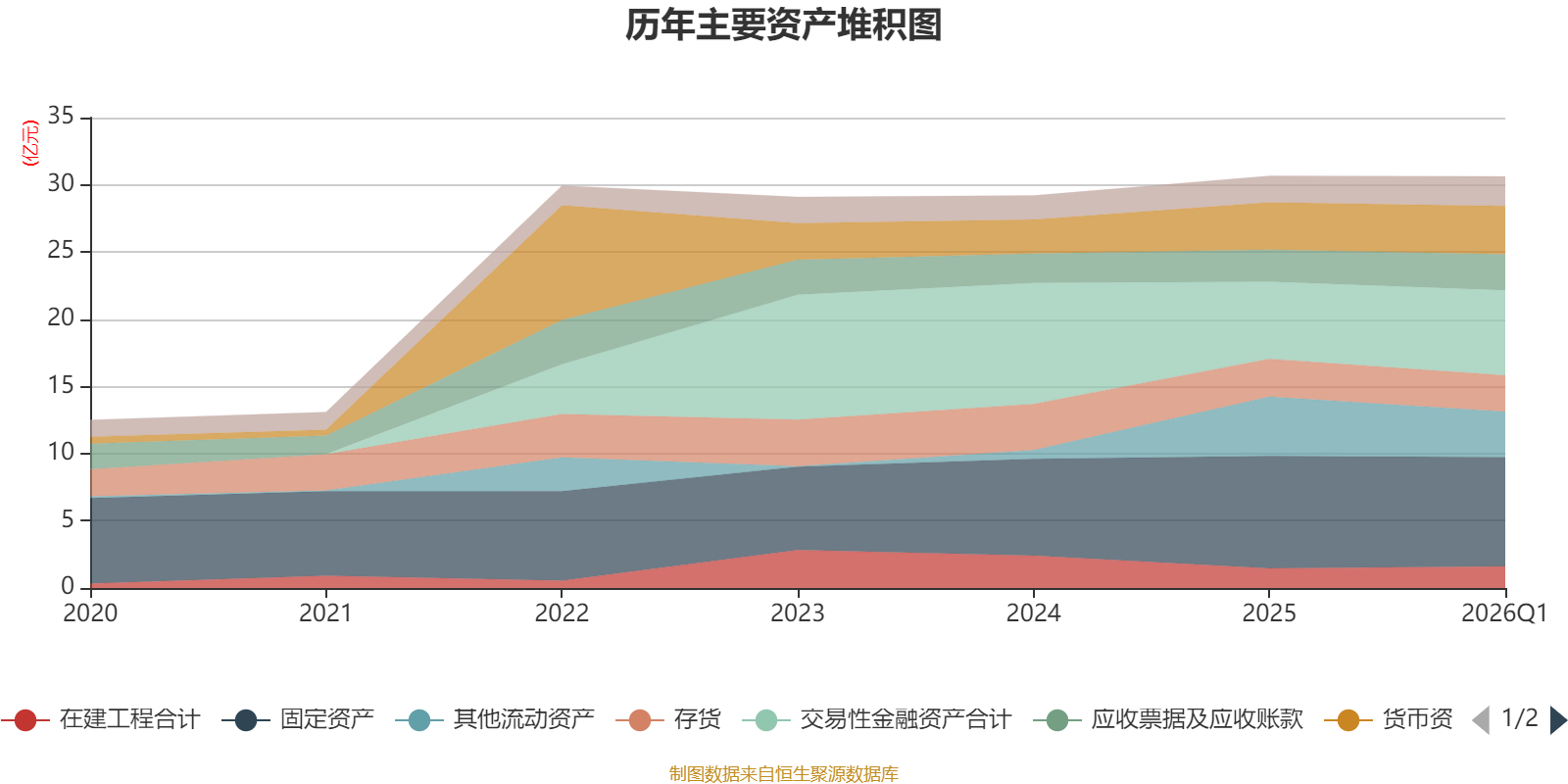 资产重大变化方面,截至2026年一季度末,公司其他流动资产较上年末减少23.46%,占公司总资产比重下降3.36个百分点;交易性金融资产合计较上年末增加10.47%,占公司总资产比重上升1.99个百分点;应收票据及应收账款较上年末增加11.47%,占公司总资产比重上升0.91个百分点;固定资产较上年末减少2.71%,占公司总资产比重下降0.7个百分点。