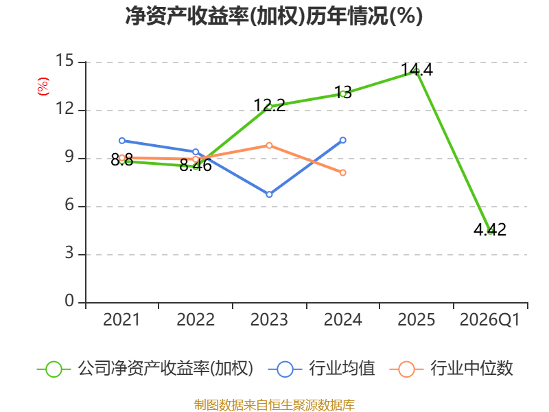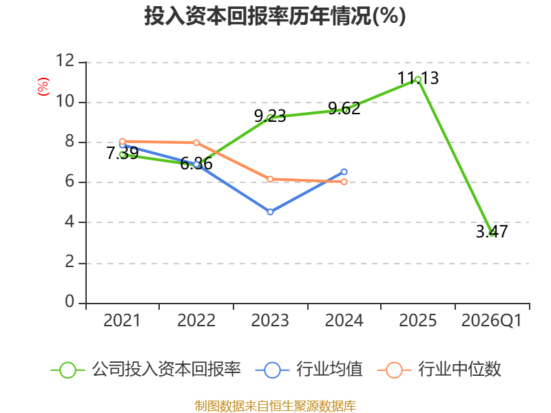盈利能力方面, 2026年一季度公司加权平均净资产收益率为4.42%,同比上升0.29个百分点。公司2026年第一季度投入资本回报率为3.47%,较上年同期上升0.55个百分点。