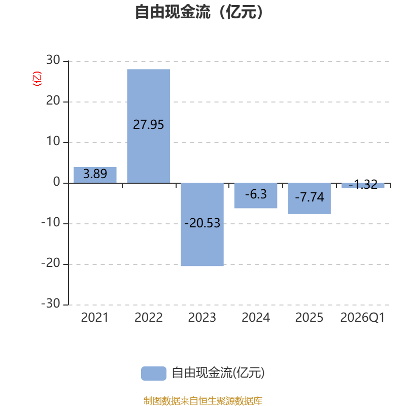 截至2026年一季度末,公司经营活动现金流净额为-3.61亿元,同比减少8.02亿元;筹资活动现金流净额4.01亿元,同比减少3.17亿元;投资活动现金流净额7.58亿元,上年同期为-6.68亿元。