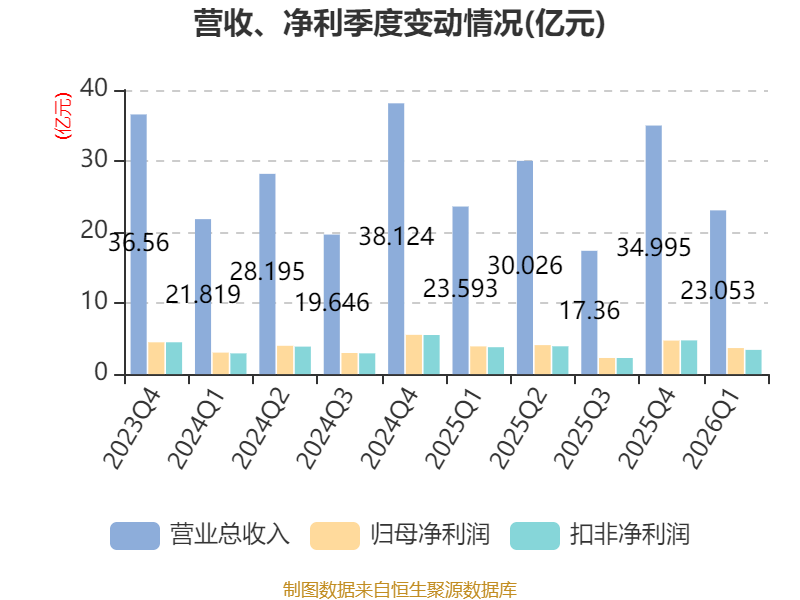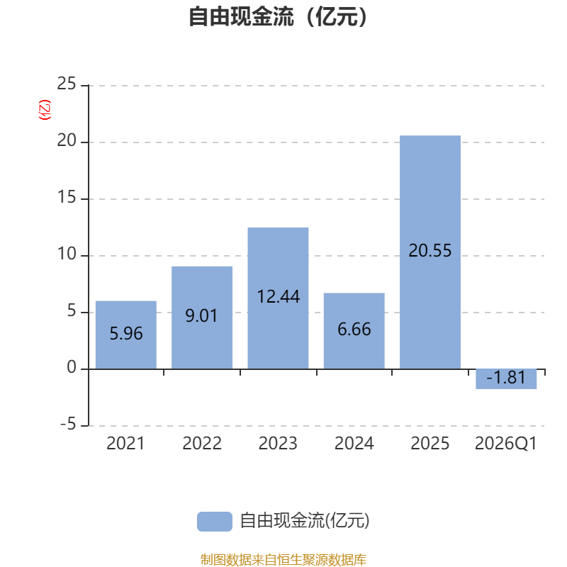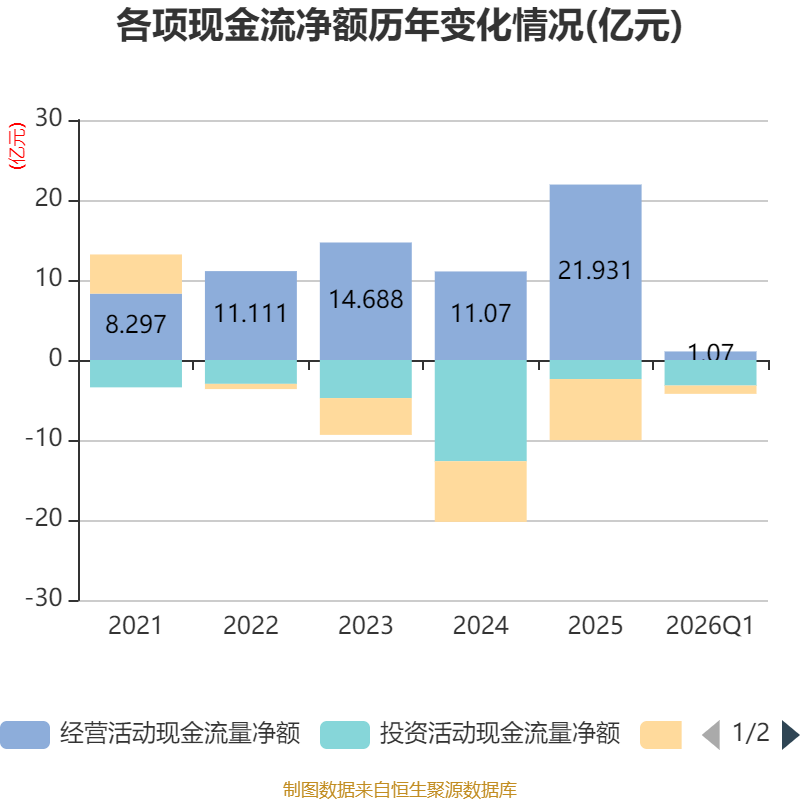 截至2026年一季度末,公司经营活动现金流净额为1.07亿元,同比下降84.16%;筹资活动现金流净额-1.04亿元,同比减少1.01亿元;投资活动现金流净额-3.19亿元,上年同期为-2882.22万元。