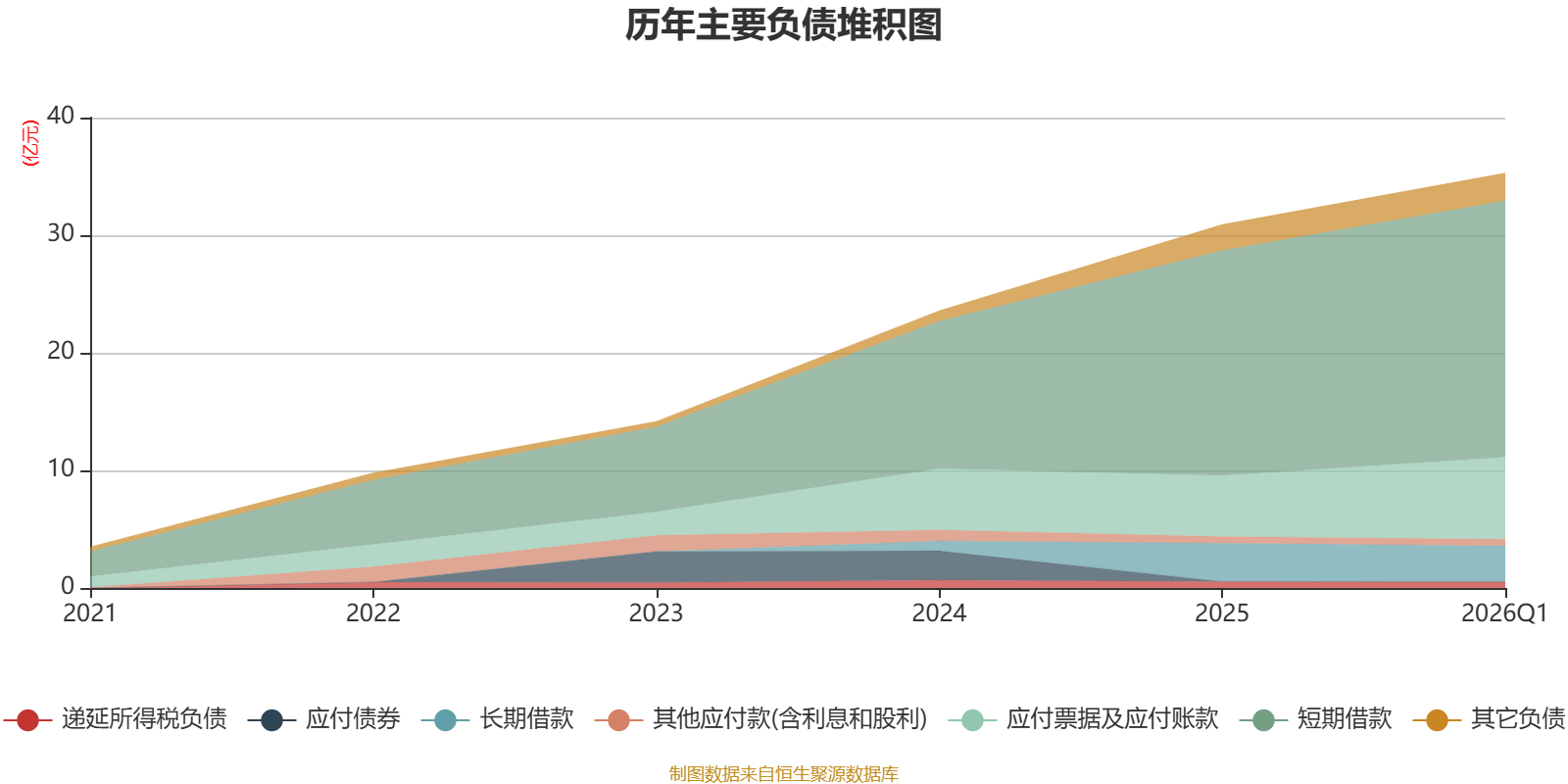 负债重大变化方面,截至2026年一季度末,公司应付票据及应付账款较上年末增加34.41%,占公司总资产比重上升2.26个百分点;长期借款较上年末减少6.81%,占公司总资产比重下降1.13个百分点;短期借款较上年末增加13.91%,占公司总资产比重上升0.91个百分点;应付职工薪酬较上年末减少50.8%,占公司总资产比重下降0.59个百分点。