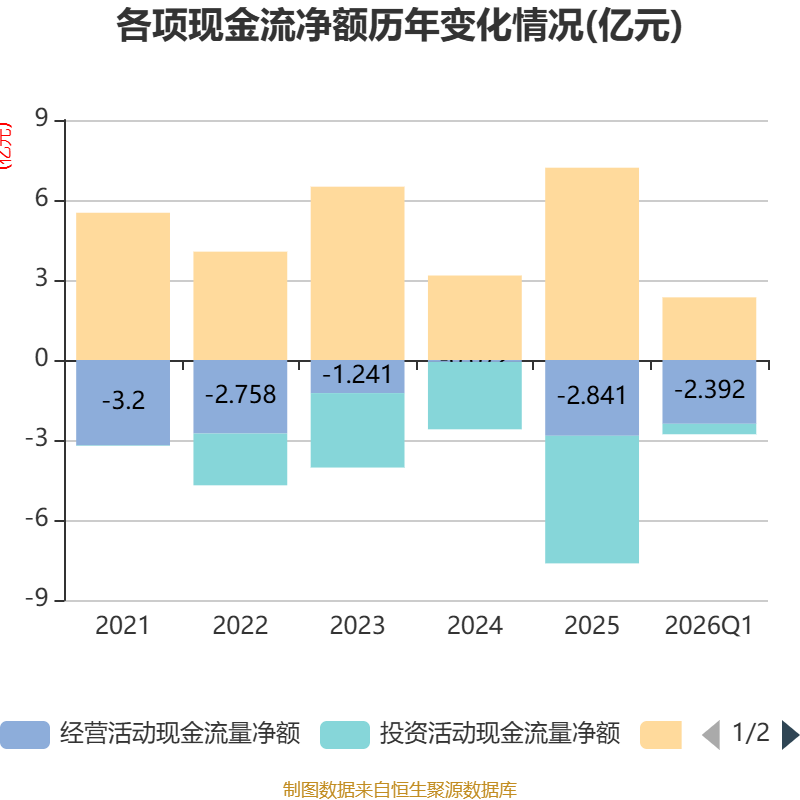 截至2026年一季度末,公司经营活动现金流净额为-2.39亿元,同比减少2.24亿元;筹资活动现金流净额2.35亿元,同比增加1.55亿元;投资活动现金流净额-3934万元,上年同期为72.98万元。
