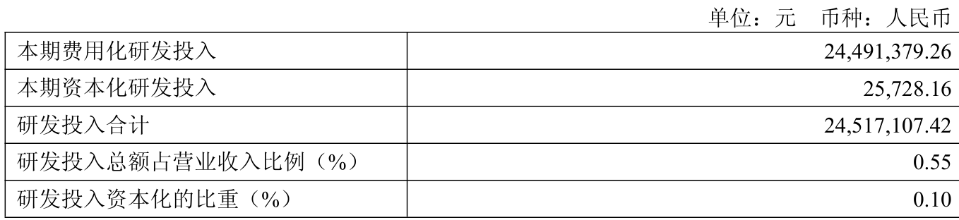 2025年全年,公司研发投入金额为2451.71万元,同比增长2.1%;研发投入占营业收入比例为0.55%,相比上年同期上升0.07个百分点。此外,公司全年研发投入资本化率为0.1%。