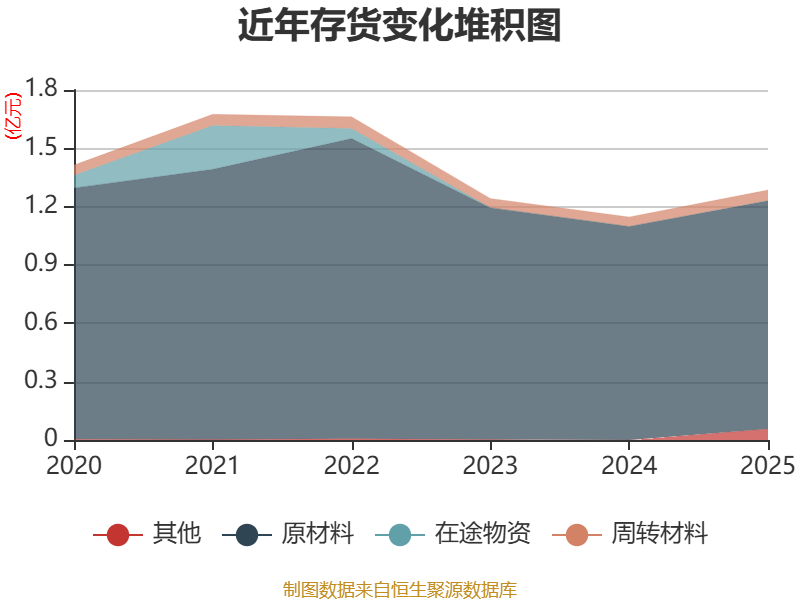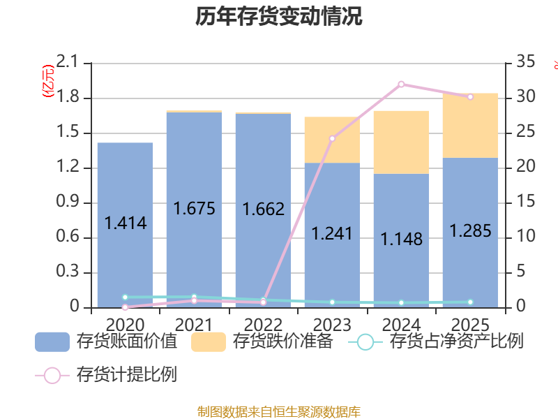 从存货变动来看,截至2025年末,公司存货账面价值为1.29亿元,占净资产的0.74%,较上年末增加1377.28万元。其中,存货跌价准备为5543.92万元,计提比例为30.13%。