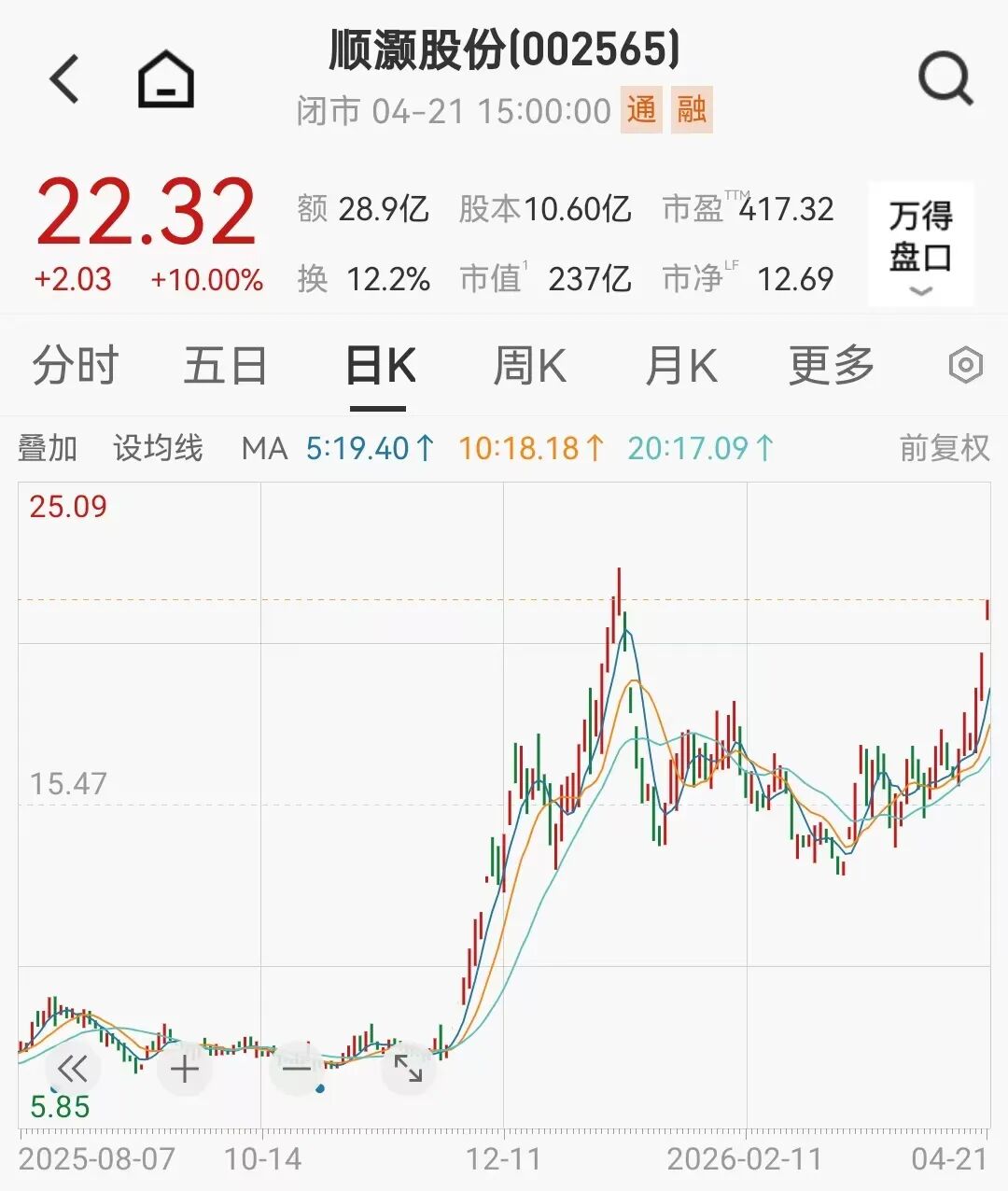 4月21日开盘后,顺灏股份一字涨停。