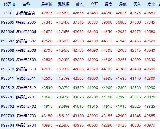 截至15时30分,PS0最新报价为42675元/吨,上涨2.56%。与4月9日低点相比,多晶硅期货价格约上涨了35%。