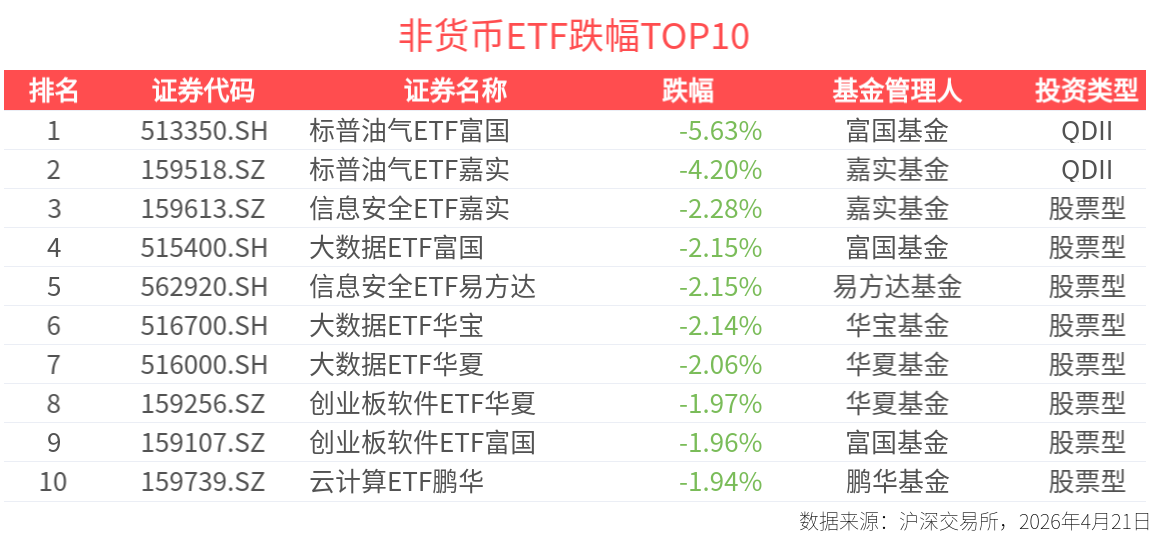 截至今日收盘,全市场共计643只非货ETF下跌,下跌比例达44%。行业主题指数方面,中证信息安全主题指数、中证大数据产业指数跌幅居前,分别下跌2.38%、2.21%。