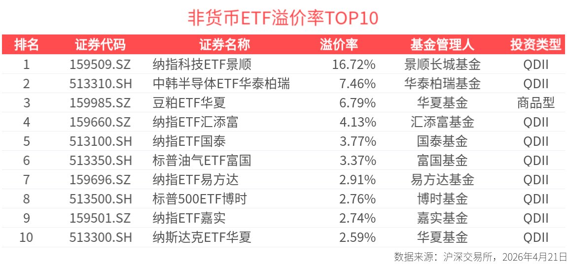 截至今日收盘,纳斯达克科技市值加权指数溢价居前,纳指科技ETF景顺收盘溢价16.72%;中证韩交所中韩半导体指数情绪高涨,中韩半导体ETF华泰柏瑞收盘溢价7.46%。