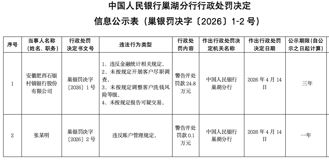 4月17日, 中国人民银行安徽省分行网站发布的行政处罚决定信息公示表(巢银罚决字〔2026〕1号)显示,安徽肥西石银村镇银行股份有限公司存在以下违法行为:1、违反金融统计相关规定。2、未按规定开展客户尽职调查。3、未按规定调整客户洗钱风险等级。4、未按规定报告可疑交易。中国人民银行巢湖分行决定对其处以警告并处罚款24.8万元。同时,张某明因违反账户管理规定被中国人民银行巢湖分行决定处以警告并处罚款0.1万元。