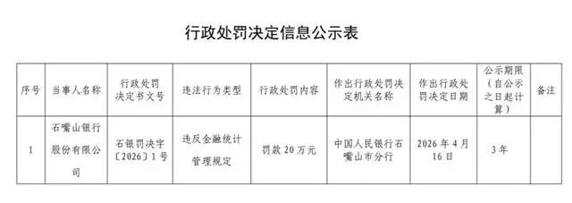 罚单显示,石嘴山银行股份有限公司的主要违法违规事实(案由)为:违反金融统计管理规定。针对上述违法违规行为,中国人民银行石嘴山市分行对其罚款 20 万元。