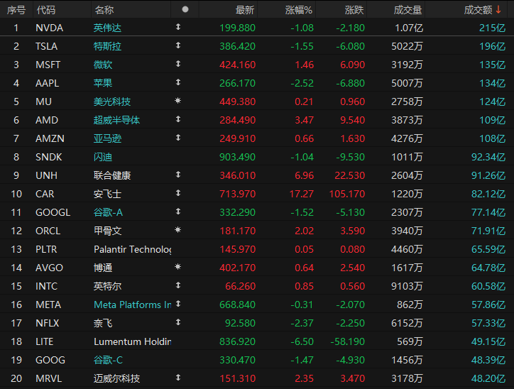 周二美股成交额第1名英伟达收跌1.08%,成交215亿美元。特朗普周一称赞苹果现任CEO库克和英伟达CEO黄仁勋。