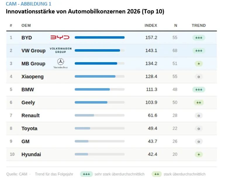 当地时间4月21日,汽车市场研究机构德国汽车管理中心(CAM)发布《2026年汽车创新报告》,中国制造商比亚迪以157分首次荣登全球汽车行业创新排行榜榜首,超越去年的冠军大众汽车(143分)。梅赛德斯-奔驰以134分位列第三。小鹏汽车(128分)、宝马和吉利集团位列第四至第六。雷诺、丰田、通用汽车和现代汽车紧随其后,位列前十。这是自2005年“汽车创新研究”项目启动以来,中国汽车制造商首次夺冠。