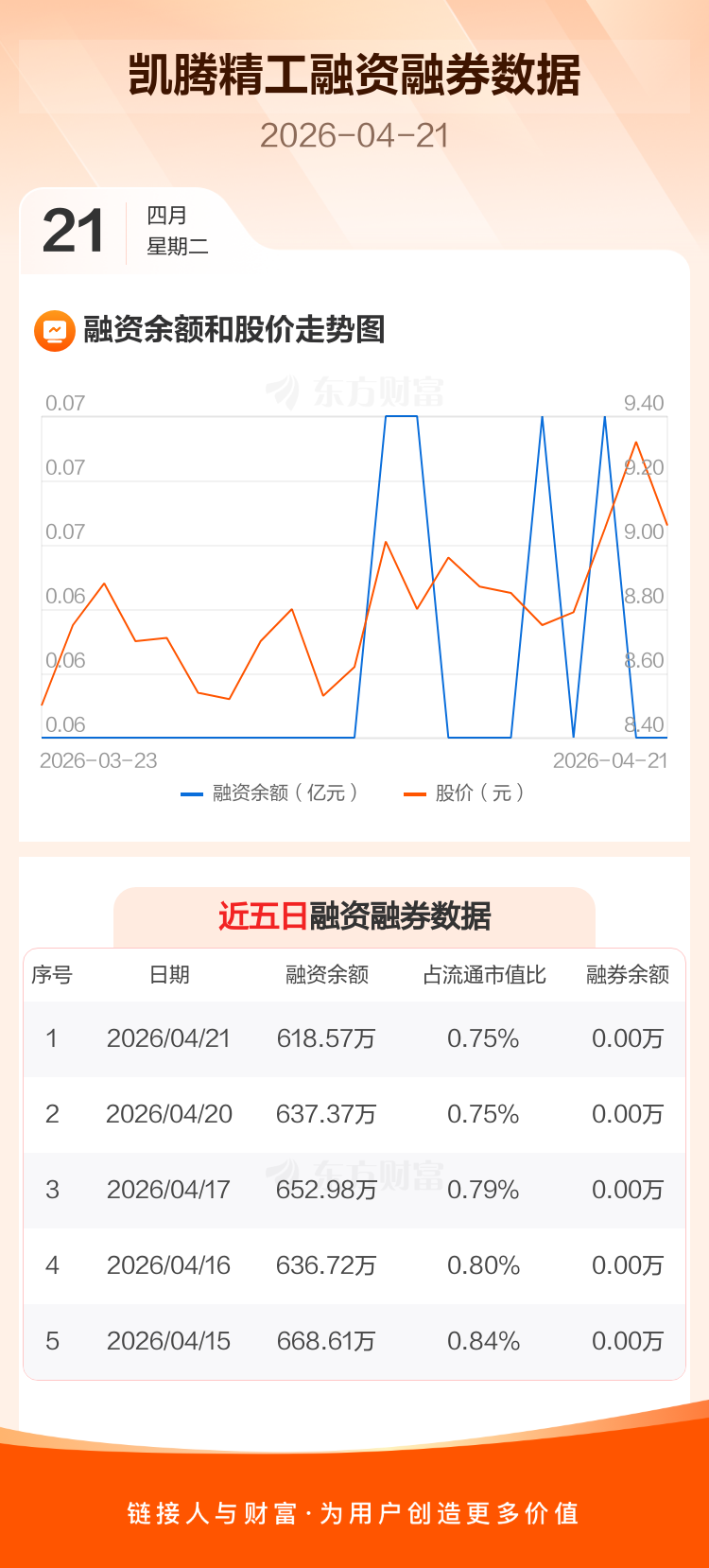 交易所最新数据显示,凯腾精工于2026年4月21日获融资买入31.03万元,融资偿还49.83万元,当日融资净偿还18.8万元。目前,该股融资余额618.57万,占流通市值比例为0.75%。