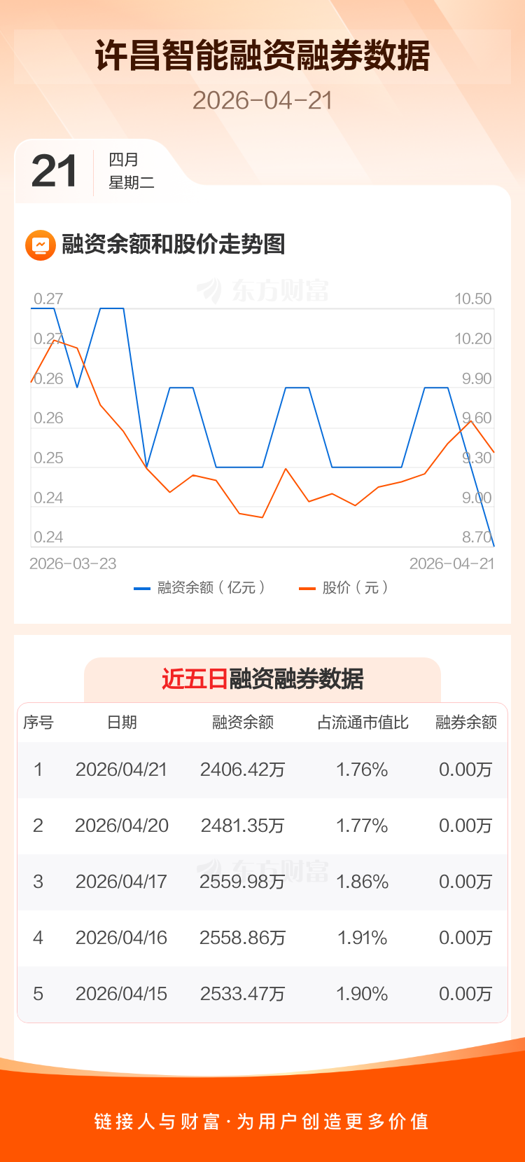 交易所最新数据显示,许昌智能于2026年4月21日获融资买入124.87万元,融资偿还199.79万元,当日融资净偿还74.93万元。目前,该股融资余额2406.42万,占流通市值比例为1.76%。