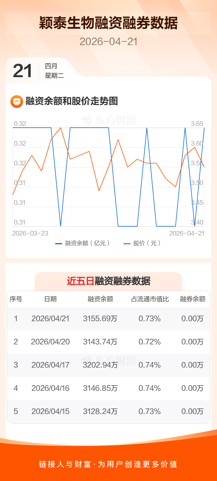 交易所最新数据显示,颖泰生物于2026年4月21日获融资买入31.03万元,融资偿还19.09万元,当日融资净买入11.95万元。目前,该股融资余额3155.69万,占流通市值比例为0.73%。