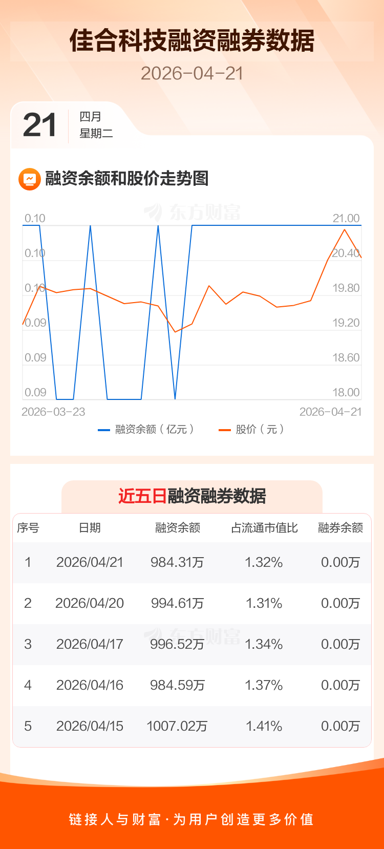 交易所最新数据显示,佳合科技于2026年4月21日获融资买入72.77万元,融资偿还83.08万元,当日融资净偿还10.31万元。目前,该股融资余额984.31万,占流通市值比例为1.32%。