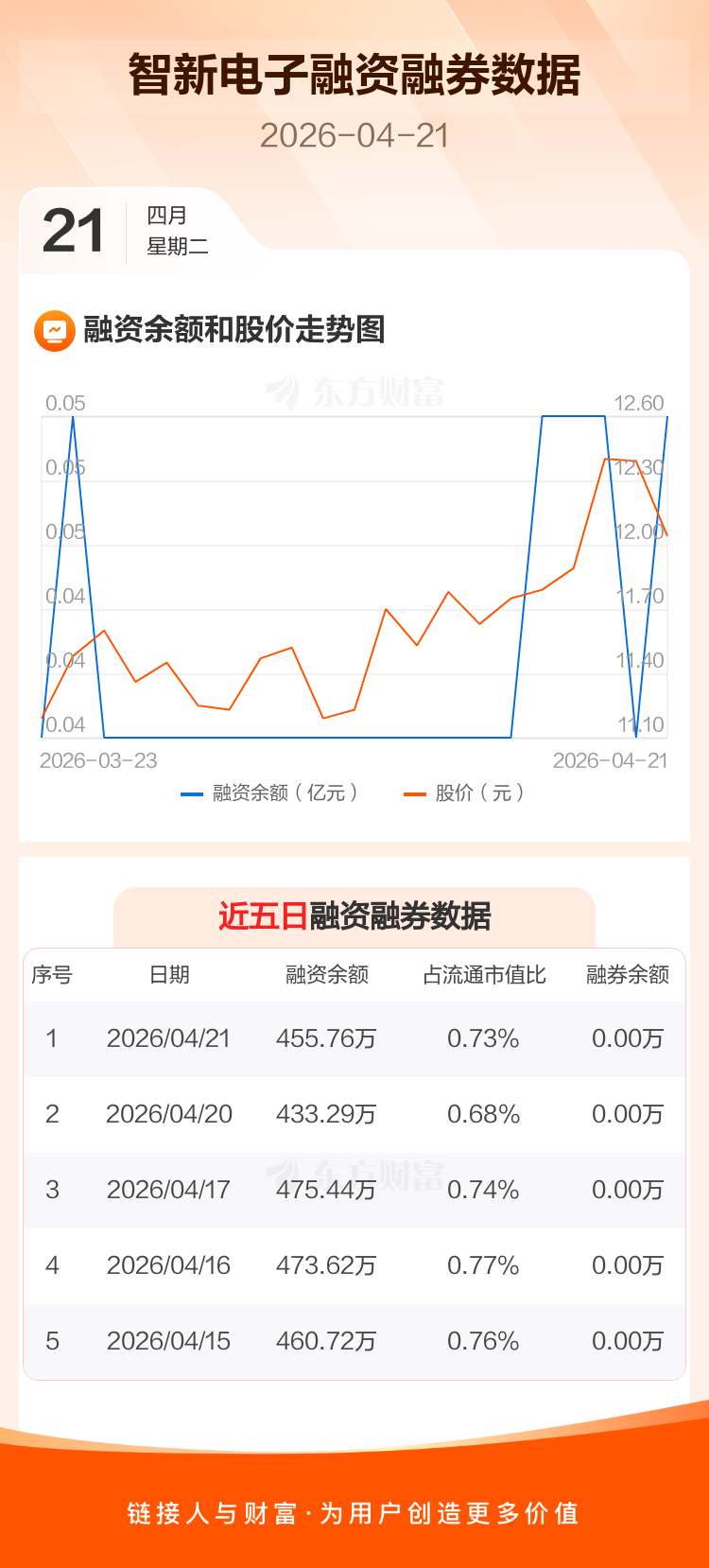 交易所最新数据显示,智新电子于2026年4月21日获融资买入45.03万元,融资偿还22.55万元,当日融资净买入22.47万元。目前,该股融资余额455.76万,占流通市值比例为0.73%。