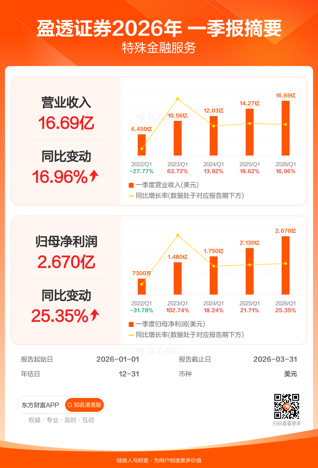 盈透证券4月21日发布一季报业绩,截至2026年3月31日的3个月内,该公司营业收入16.69亿美元,同比增长16.96%;公司权益持有人应占溢利(归母净利润)2.67亿美元,同比增长25.35%。