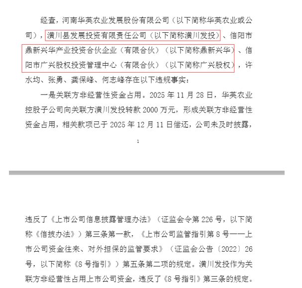 监管函显示,2025年11月28日,华英农业的控股子公司向关联方潢川县发展投资有限责任公司(以下简称潢川发投)转款2000万元,构成了关联方非经营性资金占用。这笔款项已于2025年12月11日全额归还,但公司并未及时履行信息披露义务。