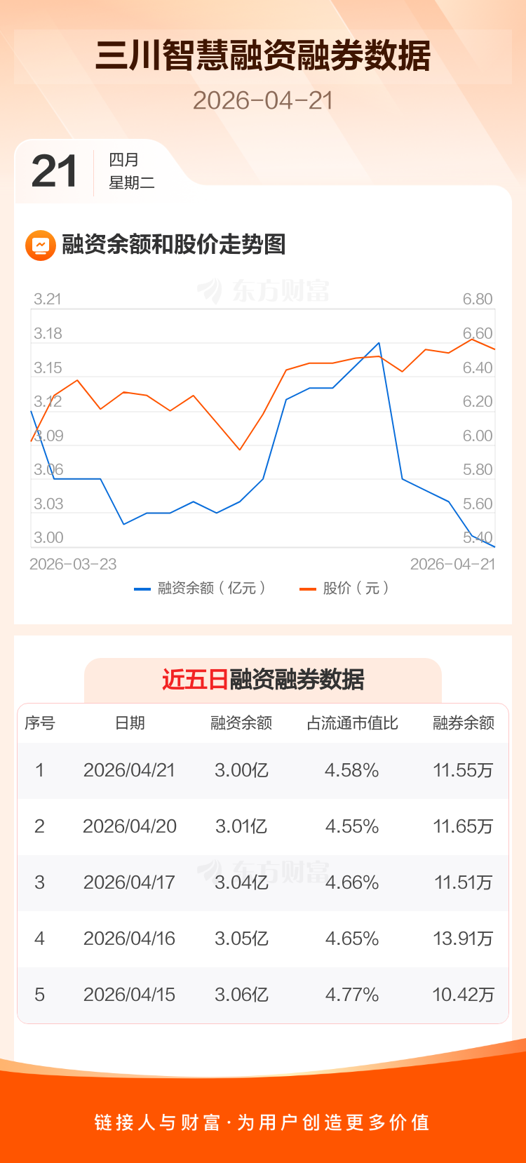 交易所最新数据显示,三川智慧于2026年4月21日获融资买入1045.25万元,融资偿还1143.70万元,当日融资净偿还98.45万元。目前,该股融资余额3.00亿,占流通市值比例为4.58%。