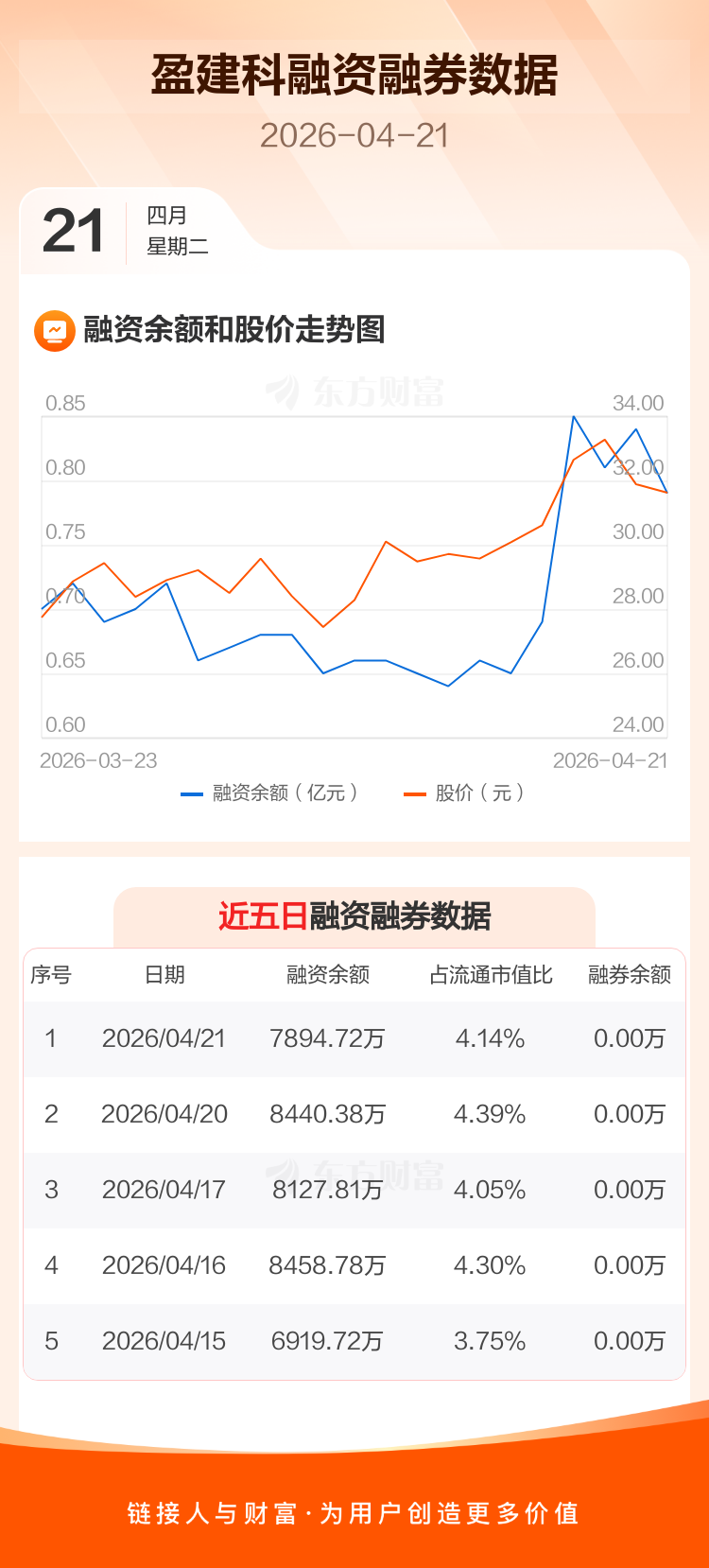 交易所最新数据显示,盈建科于2026年4月21日获融资买入594.92万元,融资偿还1140.58万元,当日融资净偿还545.66万元。目前,该股融资余额7894.72万,占流通市值比例为4.14%。