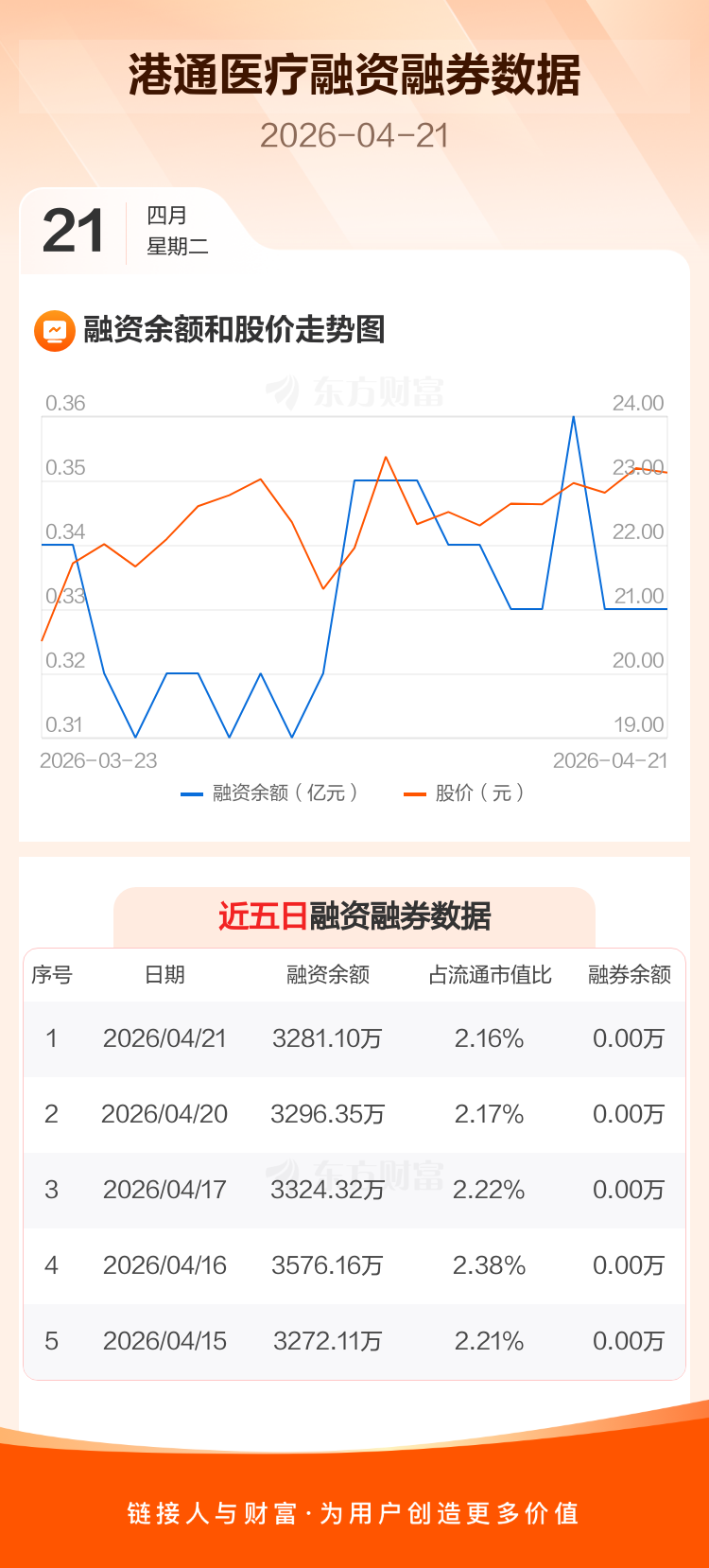 交易所最新数据显示,港通医疗于2026年4月21日获融资买入167.13万元,融资偿还182.38万元,当日融资净偿还15.25万元。目前,该股融资余额3281.10万,占流通市值比例为2.16%。