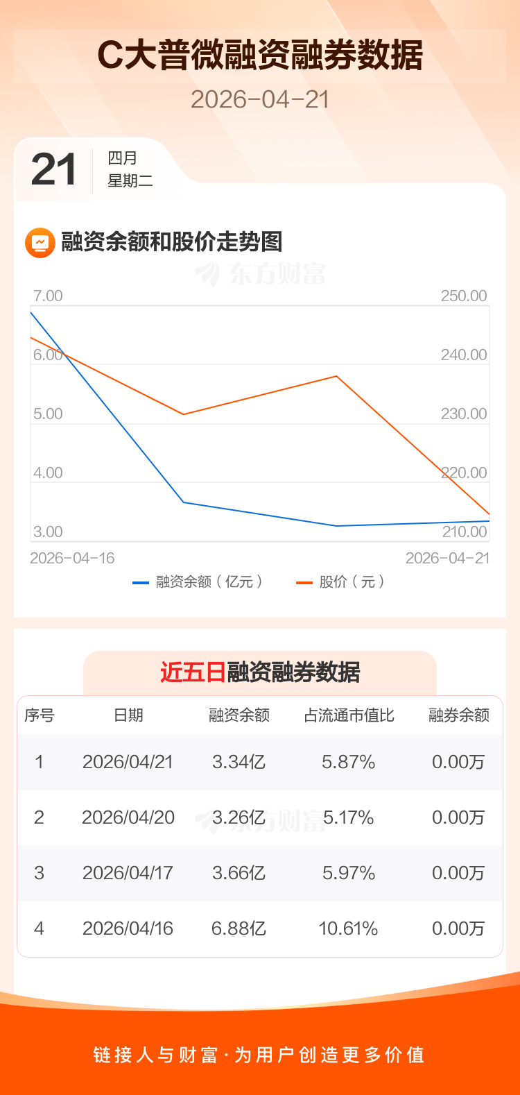 交易所最新数据显示,C大普微于2026年4月21日获融资买入1.79亿元,融资偿还1.71亿元,当日融资净买入794.25万元。目前,该股融资余额3.34亿,占流通市值比例为5.87%。