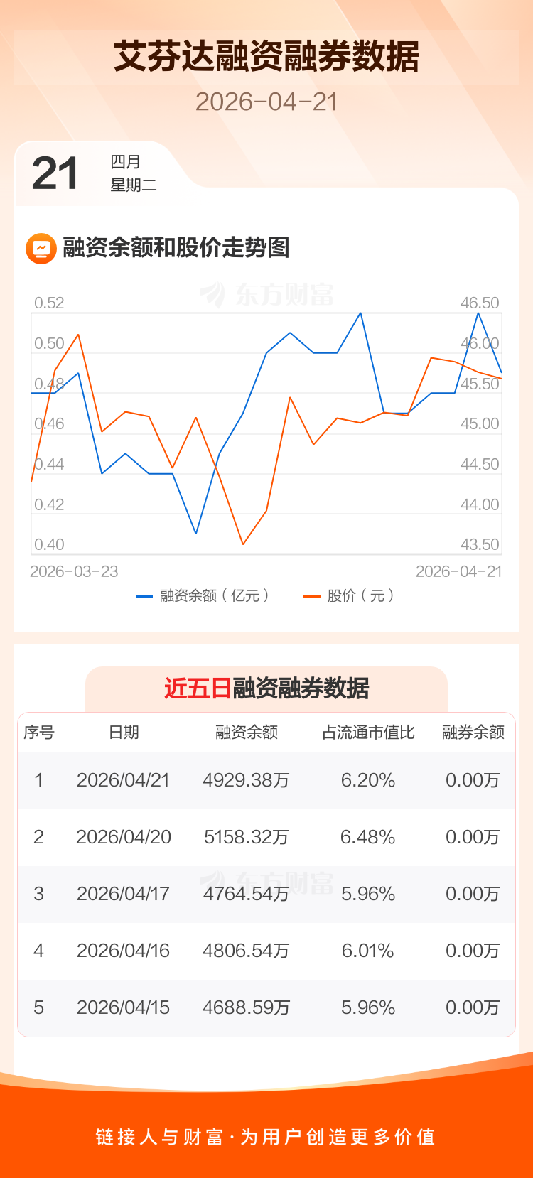 交易所最新数据显示,艾芬达于2026年4月21日获融资买入150.08万元,融资偿还379.02万元,当日融资净偿还228.94万元。目前,该股融资余额4929.38万,占流通市值比例为6.20%。