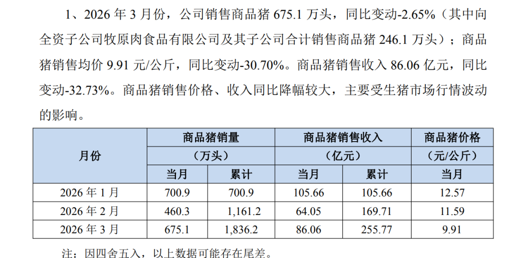 从行业整体来看,2026年一季度国内生猪市场延续供过于求格局,生猪价格持续走低,成为压制养殖企业盈利的核心因素。前期生猪产能保持高位,市场供给充足,而终端消费需求未见明显回暖,供需失衡直接导致猪价跌至阶段性低位。在行业普遍亏损的背景下,头部企业亦难以独善其身。