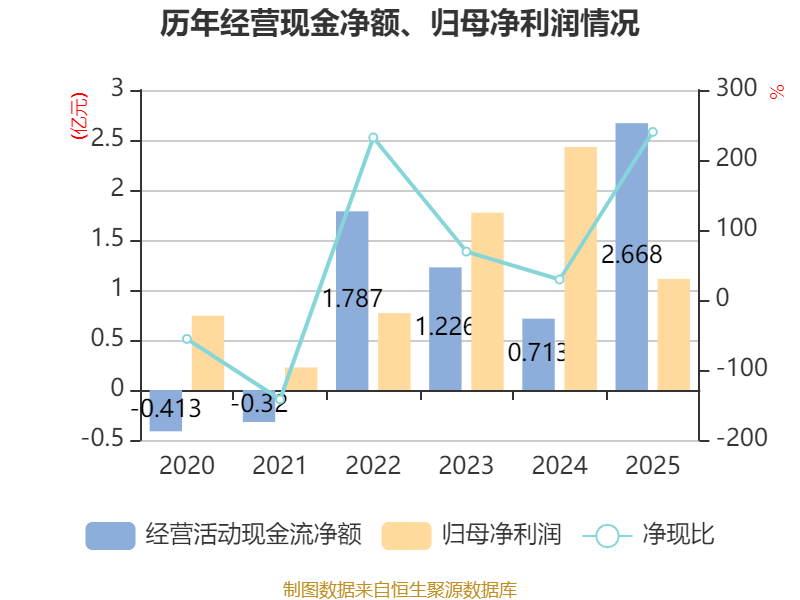 截至2025年,公司经营活动现金流净额为2.67亿元,同比增长274.31%;筹资活动现金流净额-6869.21万元,同比增加1.5亿元;投资活动现金流净额-5198.69万元,上年同期为-8290.45万元。