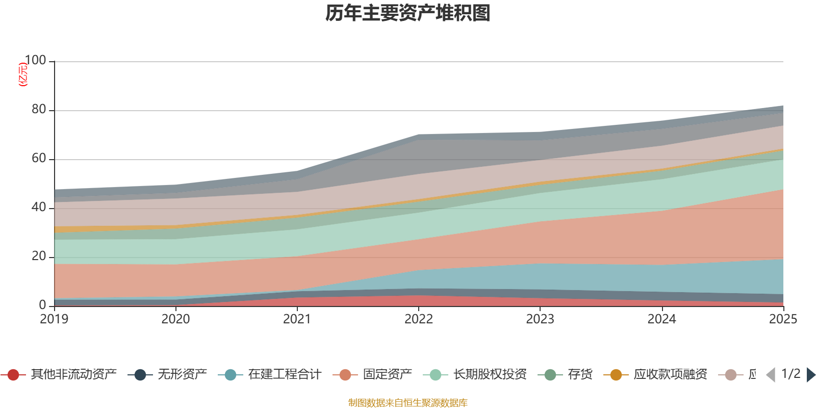 资产重大变化方面,截至2025年末,公司固定资产较上年末增加29.32%,占公司总资产比重上升5.69个百分点;在建工程合计较上年末增加29.69%,占公司总资产比重上升2.9个百分点;货币资金较上年末减少25.18%,占公司总资产比重下降2.8个百分点;长期股权投资较上年末减少5.31%,占公司总资产比重下降2.13个百分点。