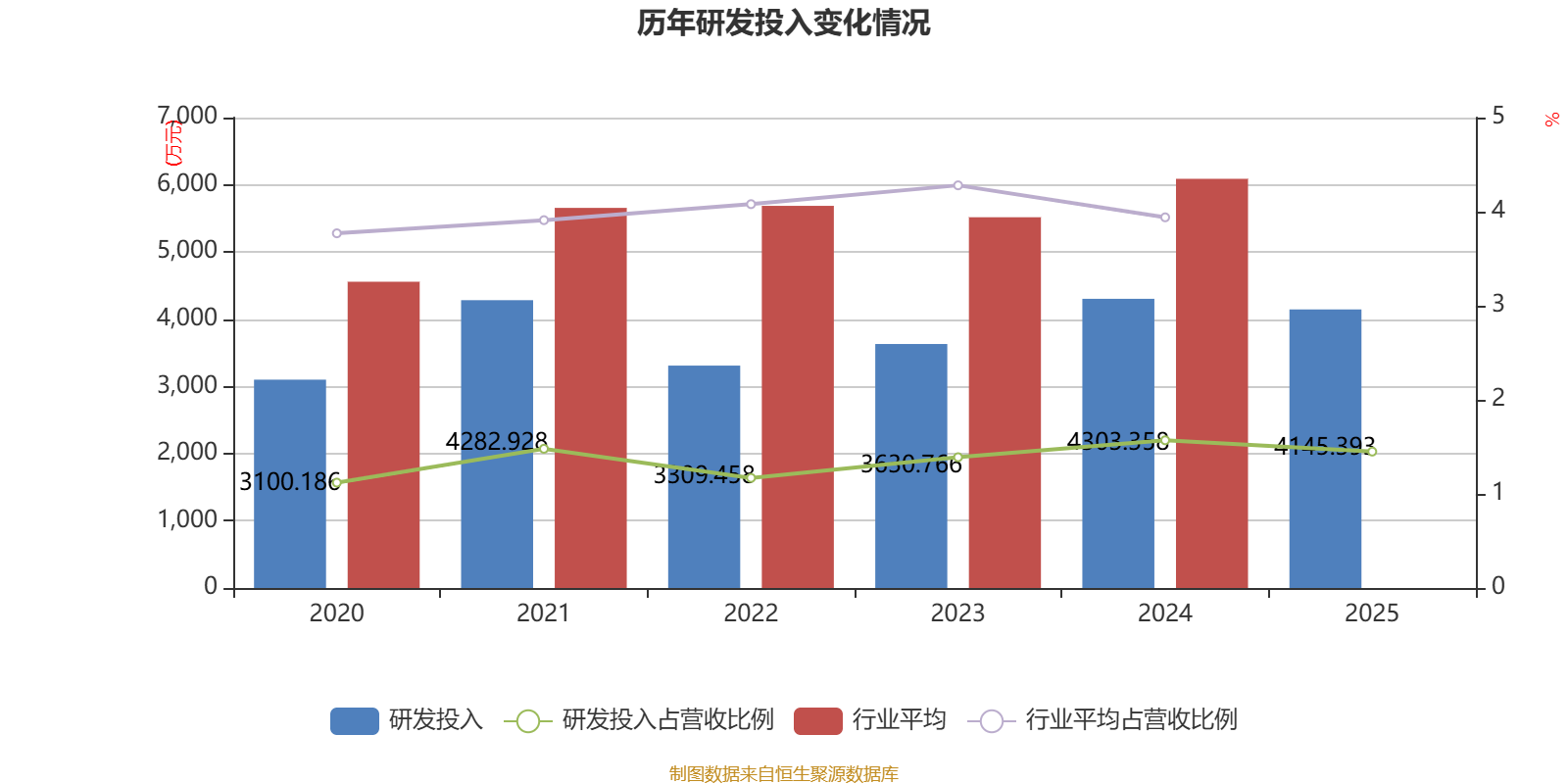 2025年全年,公司研发投入金额为4145.39万元,同比下降3.67%;研发投入占营业收入比例为1.45%,相比上年同期下降0.12个百分点。此外,公司全年研发投入资本化率为0%。