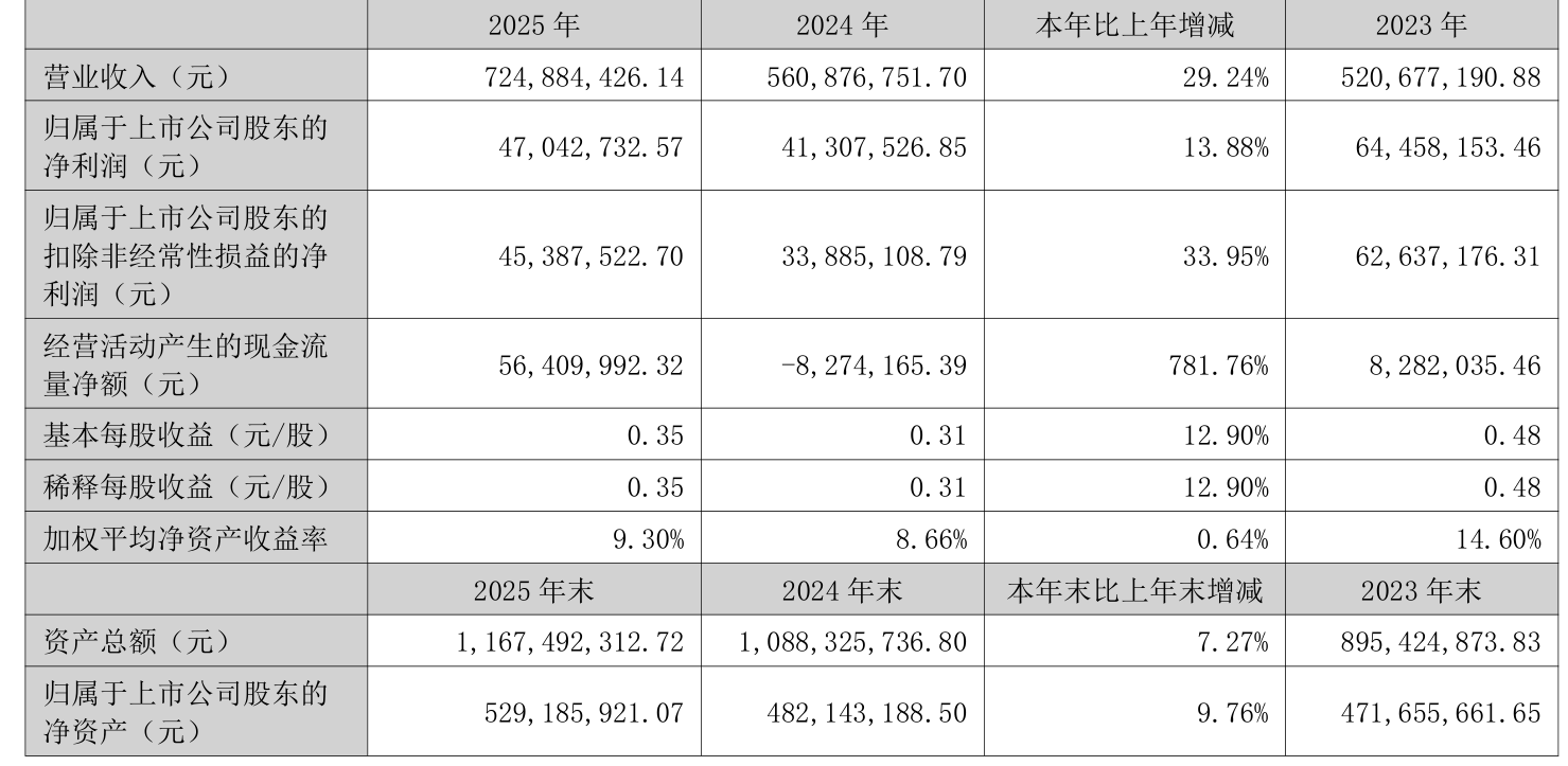 中证智能财讯万马科技(300698)4月22日披露2025年年度报告。2025年,公司实现营业总收入7.25亿元,同比增长29.24%;归母净利润4704.27万元,同比增长13.88%;扣非净利润4538.75万元,同比增长33.95%;经营活动产生的现金流量净额为5641万元,上年同期为-827.42万元;报告期内,万马科技基本每股收益为0.35元,加权平均净资产收益率为9.30%。