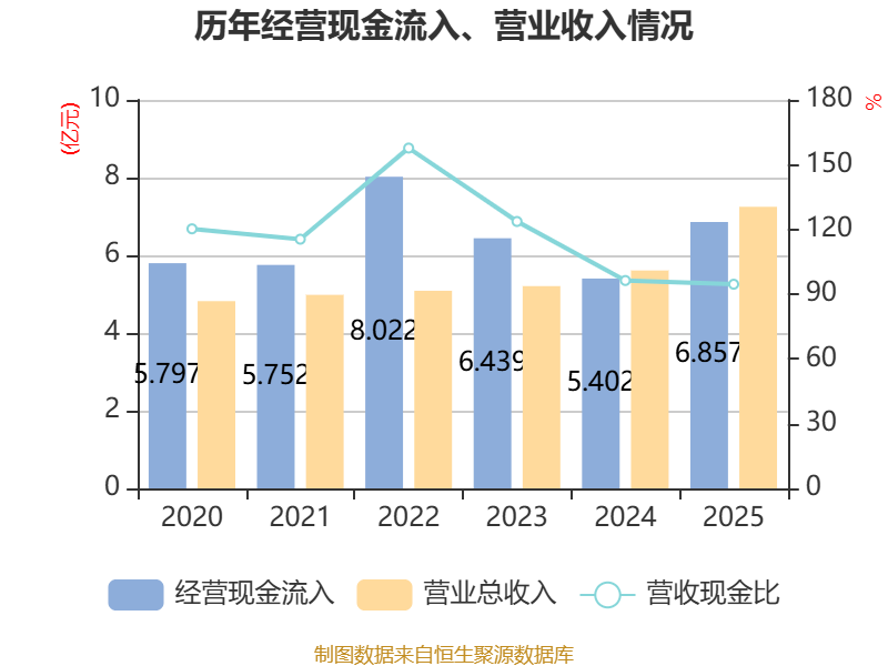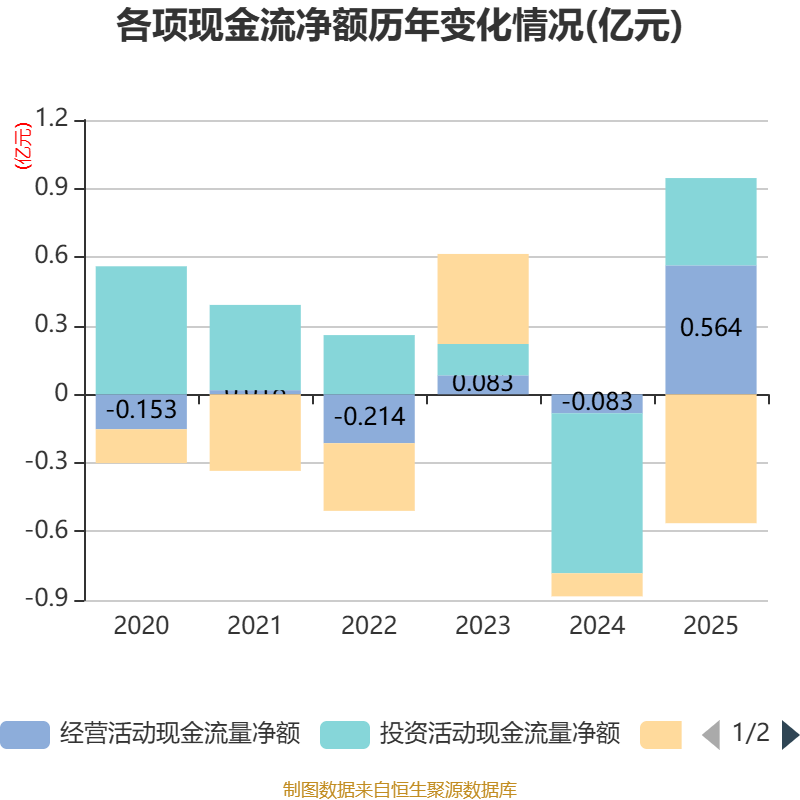 截至2025年,公司经营活动现金流净额为5641万元,同比增加6468.42万元;筹资活动现金流净额-5640.68万元,同比减少4633.54万元;投资活动现金流净额3821.51万元,上年同期为-7002.41万元。