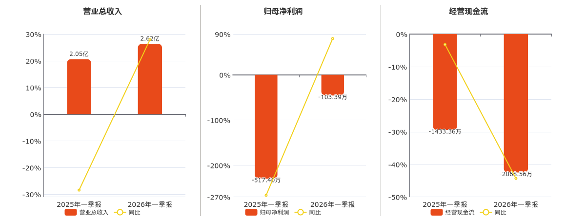 公司营业总收入为2.62亿元。归母净利润为-103.39万元。经营活动现金净流入为-2068.56万元,较去年同报告期经营活动现金净流入减少635.20万元。