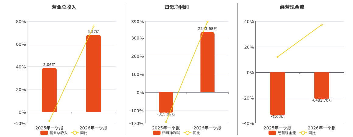 公司营业总收入为5.37亿元。归母净利润为2343.68万元。经营活动现金净流入为-6481.70万元。