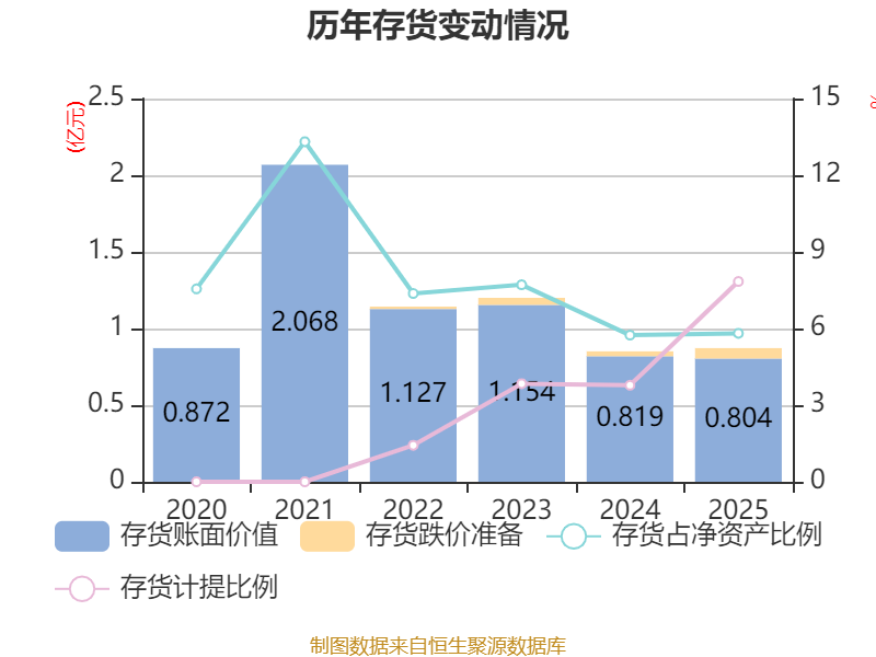 从存货变动来看,截至2025年末,公司存货账面价值为8041.23万元,占净资产的5.81%,较上年末减少146.5万元。其中,存货跌价准备为683.78万元,计提比例为7.84%。
