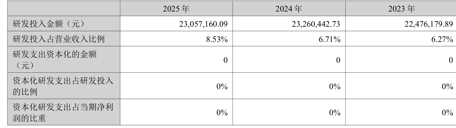 2025年全年,公司研发投入金额为2305.72万元,同比下降0.87%;研发投入占营业收入比例为8.53%,相比上年同期上升1.82个百分点。此外,公司全年研发投入资本化率为0%。