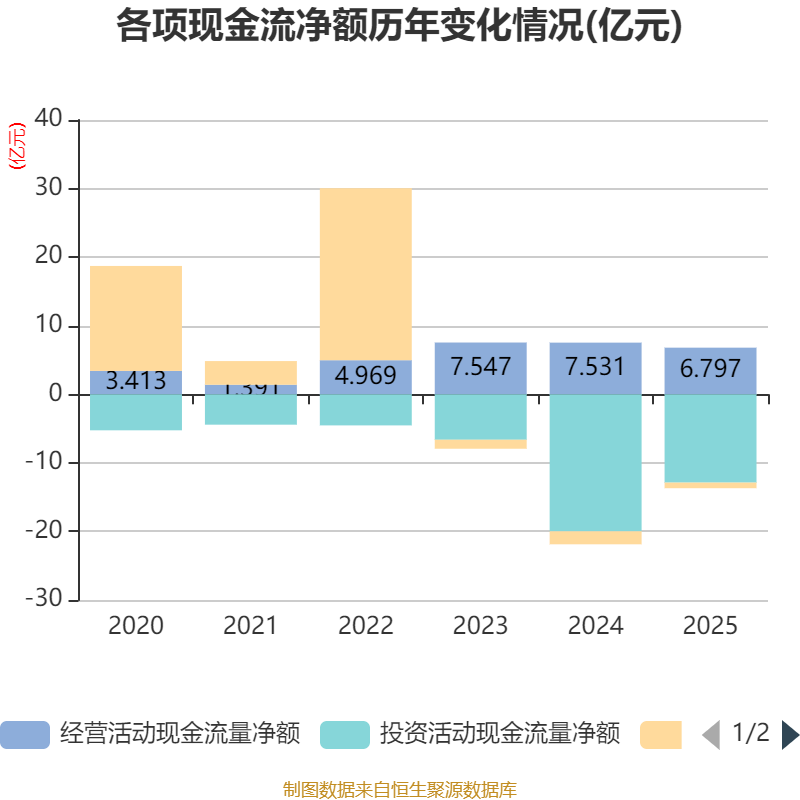 截至2025年,公司经营活动现金流净额为6.8亿元,同比下降9.74%;筹资活动现金流净额-8175.96万元,同比增加1.08亿元;投资活动现金流净额-12.88亿元,上年同期为-19.98亿元。