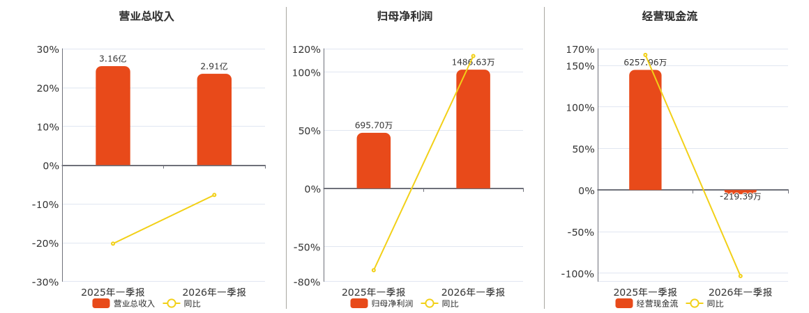 公司营业总收入为2.91亿元。归母净利润为1486.63万元,较去年同报告期归母净利润增加790.94万元,同比较去年同期上涨113.69%。经营活动现金净流入为-219.39万元。