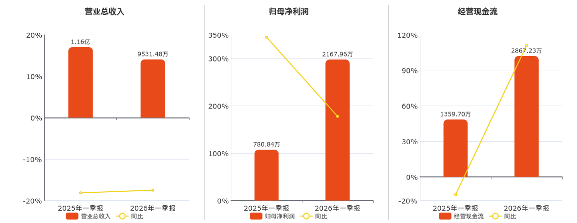公司营业总收入为9531.48万元。归母净利润为2167.96万元,较去年同报告期归母净利润增加1387.12万元,实现2年连续上涨,同比较去年同期上涨177.64%。经营活动现金净流入为2867.23万元,较去年同报告期经营活动现金净流入增加1507.53万元,同比较去年同期上涨110.87%。