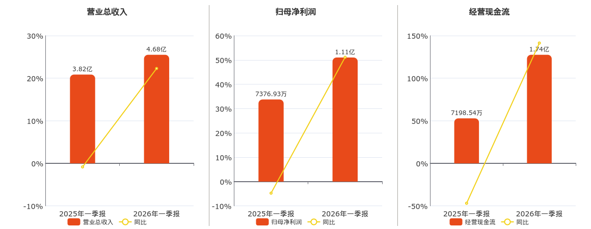 公司营业总收入为4.68亿元。归母净利润为1.11亿元。经营活动现金净流入为1.74亿元。