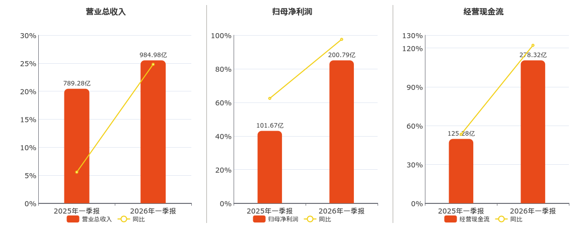 公司营业总收入为984.98亿元,较去年同报告期营业总收入增加195.69亿元,实现2年连续上涨,同比较去年同期上涨24.79%。归母净利润为200.79亿元,较去年同报告期归母净利润增加99.13亿元,实现3年连续上涨,同比较去年同期上涨97.50%。经营活动现金净流入为278.32亿元,较去年同报告期经营活动现金净流入增加153.04亿元,实现5年连续上涨,同比较去年同期上涨122.15%。
