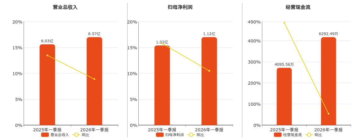 公司营业总收入为6.57亿元。归母净利润为1.12亿元。经营活动现金净流入为6292.49万元。