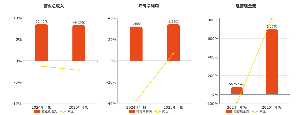 公司营业总收入为49.26亿元,较去年同报告期营业总收入减少1.13亿元,同比较去年同期下降2.25%。归母净利润为1.55亿元。经营活动现金净流入为5.17亿元。