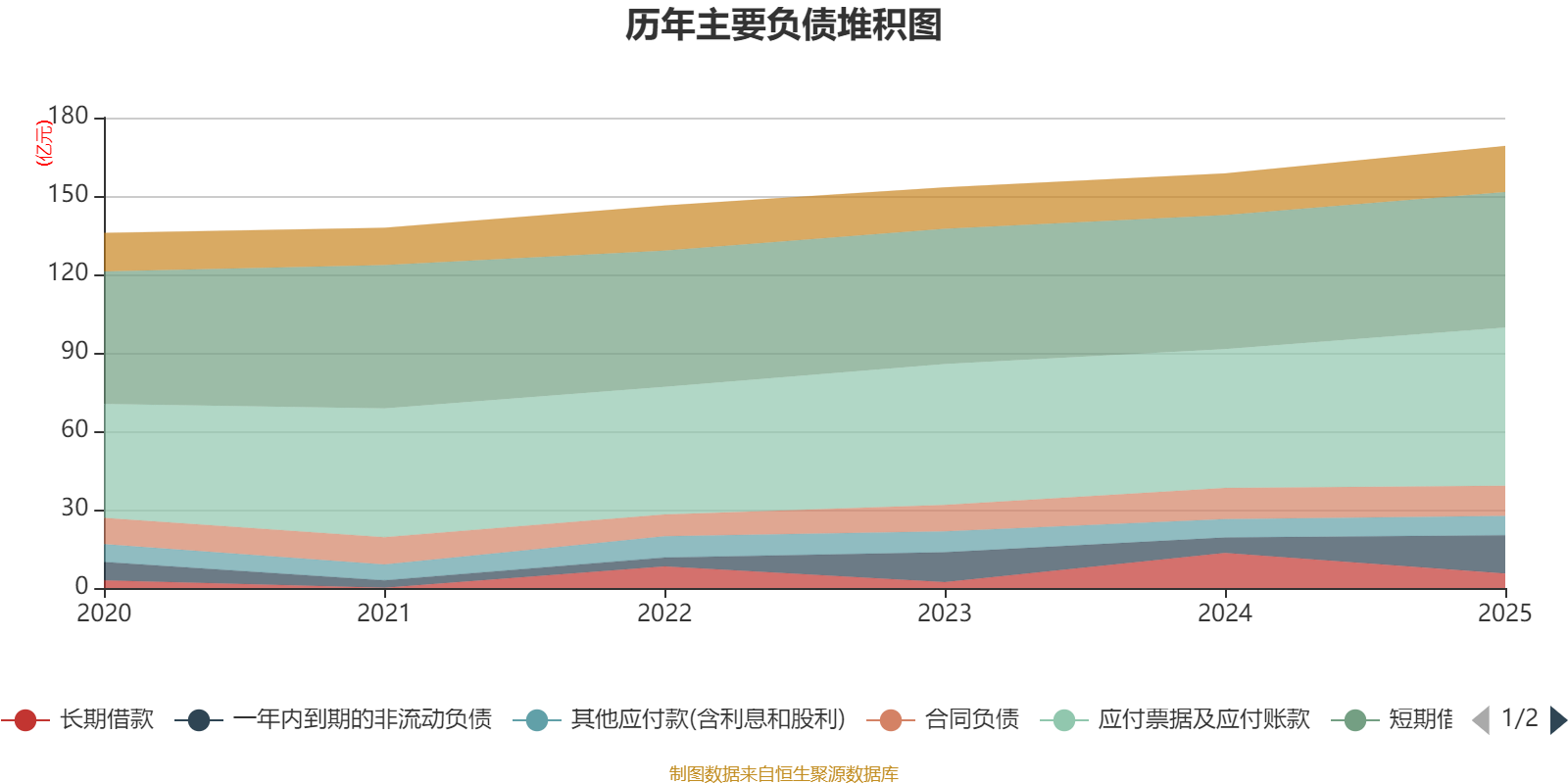 负债重大变化方面,截至2025年末,公司一年内到期的非流动负债较上年末增加147.45%,占公司总资产比重上升4个百分点;长期借款较上年末减少58.35%,占公司总资产比重下降3.99个百分点;应付票据及应付账款较上年末增加13.86%,占公司总资产比重上升2.36个百分点;短期借款较上年末增加1.13%,占公司总资产比重下降0.82个百分点。
