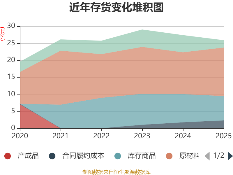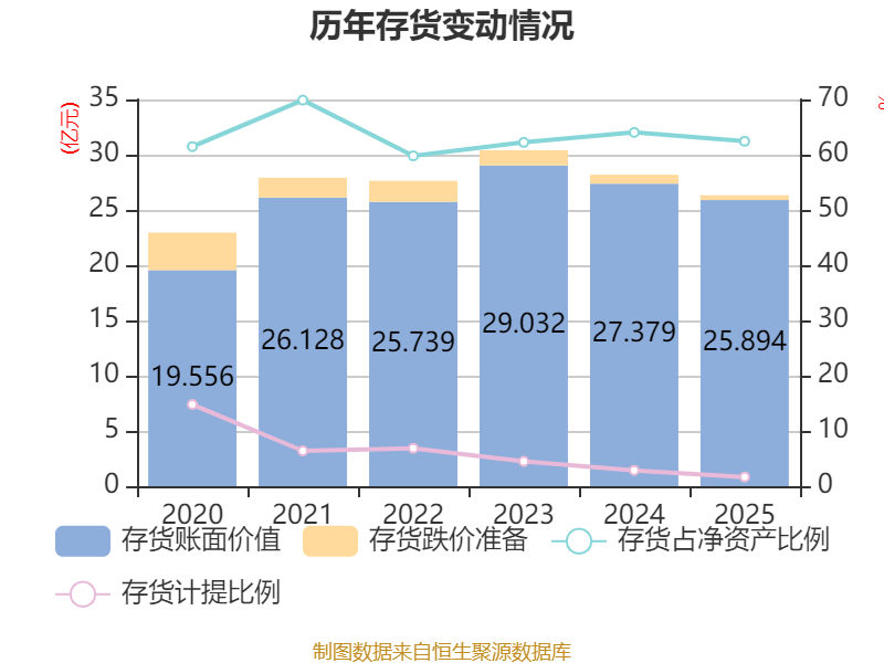 从存货变动来看,截至2025年末,公司存货账面价值为25.89亿元,占净资产的62.43%,较上年末减少1.48亿元。其中,存货跌价准备为4363.48万元,计提比例为1.66%。