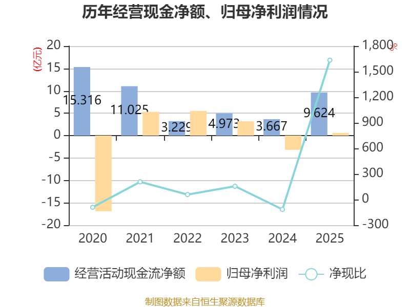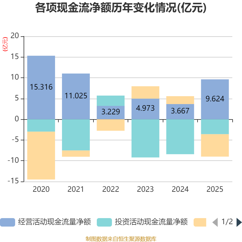截至2025年,公司经营活动现金流净额为9.62亿元,同比增长162.42%;筹资活动现金流净额-5.4亿元,同比减少7.3亿元;投资活动现金流净额-3.6亿元,上年同期为-8.42亿元。