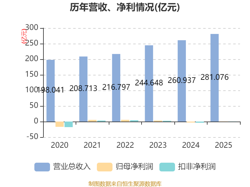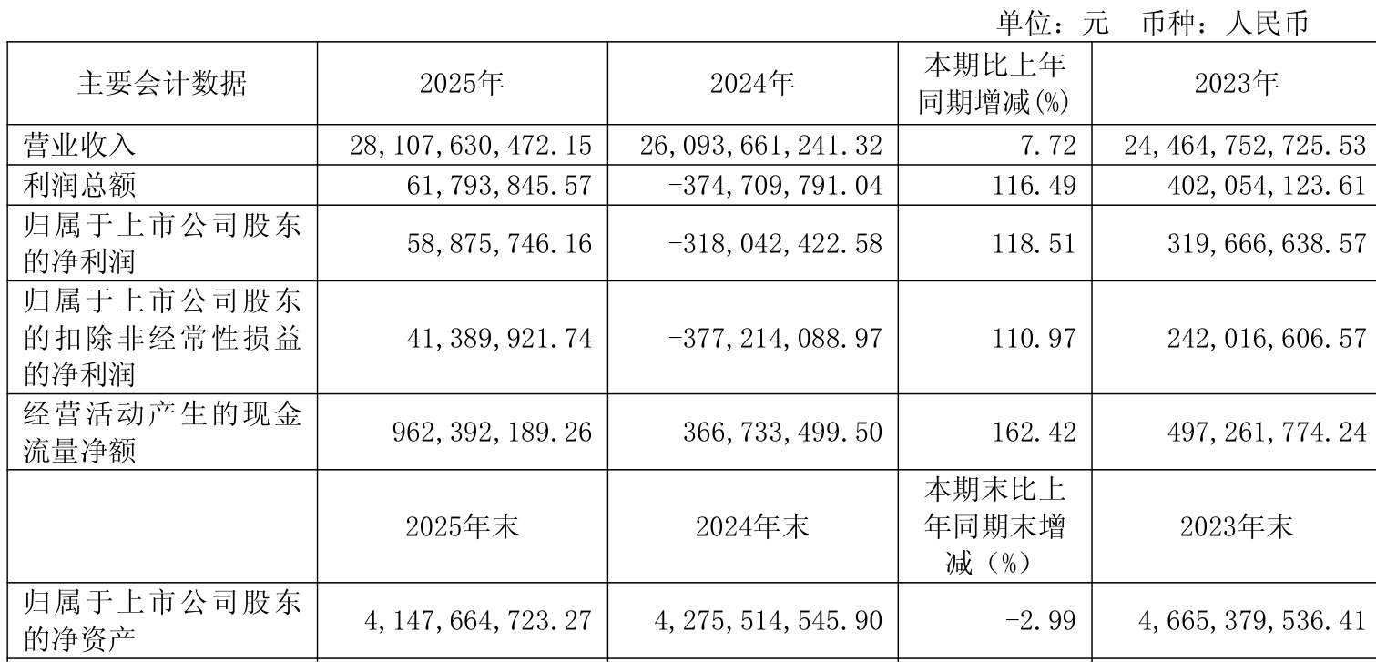 中证智能财讯远东股份(600869)4月22日披露2025年年度报告。2025年,公司实现营业总收入281.08亿元,同比增长7.72%;归母净利润5887.57万元,同比扭亏;扣非净利润4138.99万元,同比扭亏;经营活动产生的现金流量净额为9.62亿元,同比增长162.42%;报告期内,远东股份基本每股收益为0.0267元,加权平均净资产收益率为1.39%。公司2025年度分配预案为:拟向全体股东每10股派现0.1元(含税)。