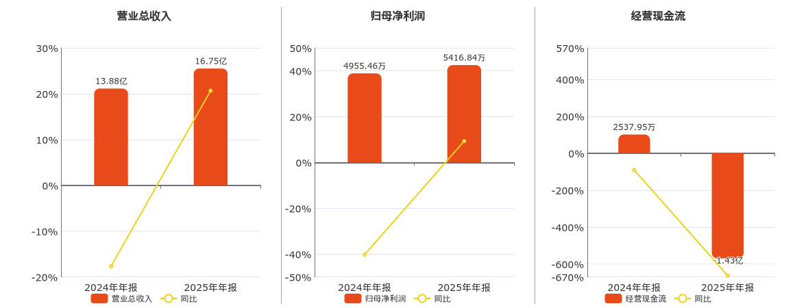 公司营业总收入为16.75亿元。归母净利润为5416.84万元。经营活动现金净流入为-1.43亿元,较去年同报告期经营活动现金净流入减少1.68亿元,同比较去年同期下降663.00%。